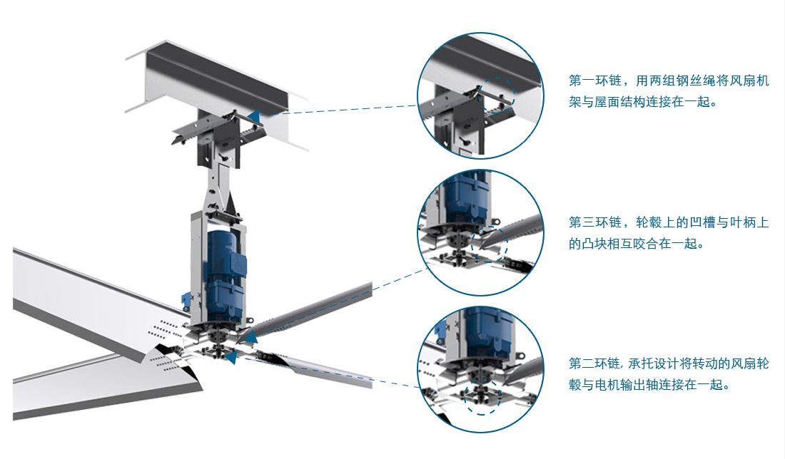 朗旗用三個相互獨立的安全環(huán)鏈設(shè)計保障超大吊扇的使用安全。