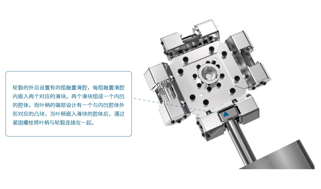 | E | 輪轂外沿4組滑孔內(nèi)的不規(guī)則形狀滑塊,限制葉片上翹范圍 The sliders inserted in the cylinders to limit the range of up & down of the blades | ■ | ■ | ■ | |