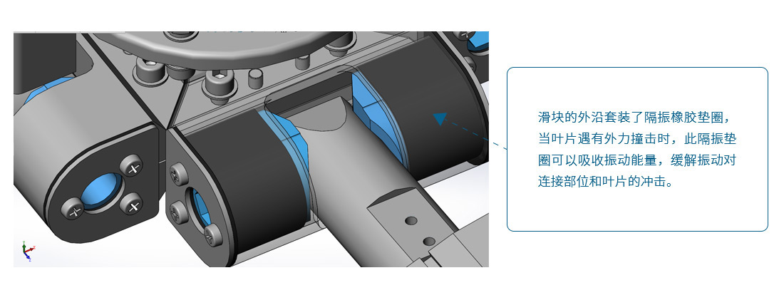 | F | 上述滑塊外襯的橡膠套吸收葉片遭遇外力撞擊時的能量,緩解沖擊 The rubber cushions coated on the sliders can absorb the vibration energy | ■ | ■ | ■ | |